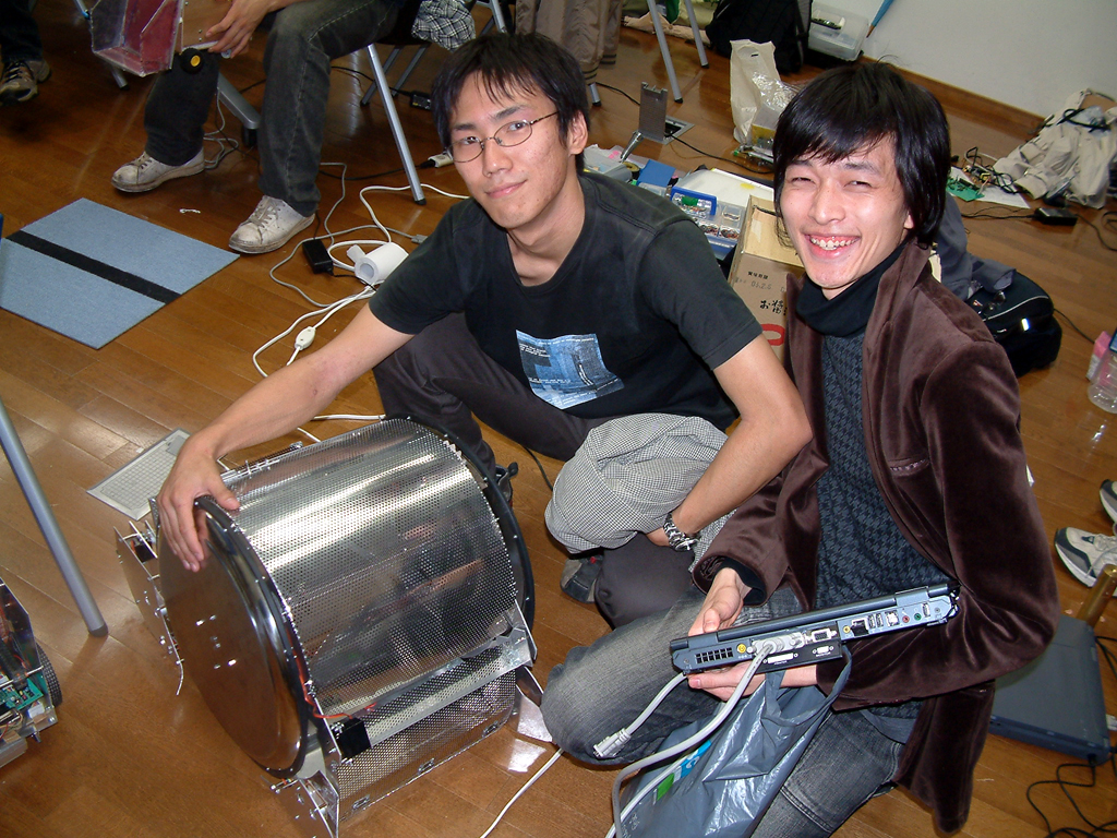 PIC15 2005年10月8日〜10日に行われた学園祭の企画、つくばロボットコンテスト2005 にサークルの後輩が参加するということで、その手伝いという形でこっそり参加しました。それにしても当人のお二人は、芸術専門学群なのに、初めてでここまで作れるとは驚きです。木製の大型歯車がいい感じです。FPGAの設計もちょっと教えただけで、一瞬でマスターしてしまいました。このロボットが、SUSUBOARDを組み込んだ最初のロボットとなりました。ロボコンの世界では、今はまだH8やPICなどが主流ですが、だんだんFPGAを搭載したロボットが増えてくることを期待しています。ちゃっかり Made by Susutawari シールも貼って頂きました。
